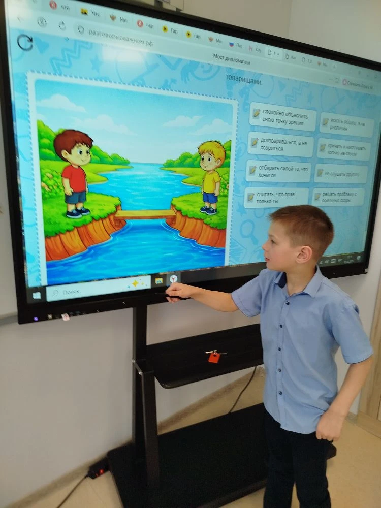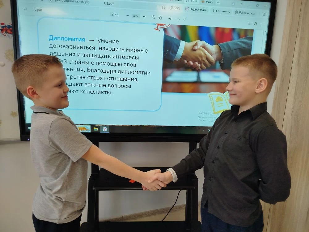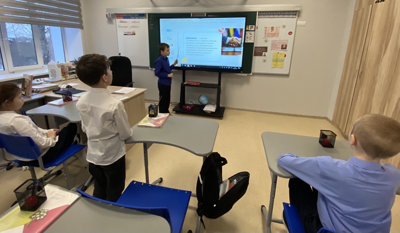 9 февраля в рамках цикла «Разговоры о важном» прошли занятия для учащихся 1–9 классов на тему «Слушать, слышать и договариваться. Кто такие дипломаты?». Мероприятие было направлено на формирование у школьников представления о дипломатии как ключевом инструменте международных отношений, а также на развитие навыков конструктивного общения в повседневной жизни. На занятиях ребята узнали, что дипломатия — это не только искусство ведения переговоров между странами, но и важный навык для мирного решения любых конфликтов. Учащиеся младших классов на примере мультфильма «Лунтик» разобрали, как можно находить компромиссы и избегать ссор, а также выполнили практическое задание «Шаги дипломата», составив алгоритм мирного решения споров.