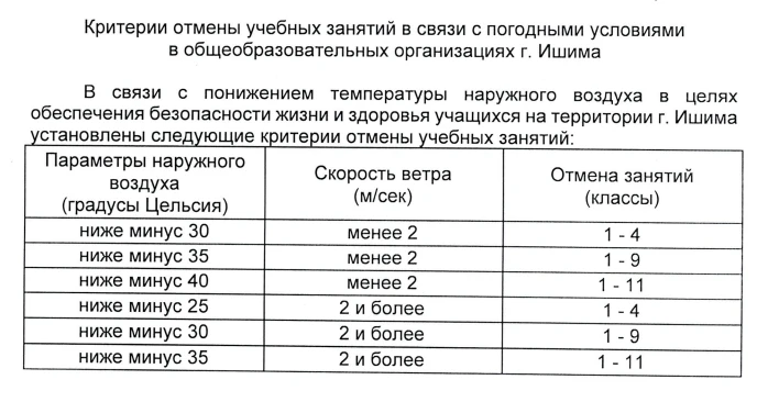 Муниципальное автономное общеобразовательное учреждение Ишимская школа-интернат » КРИТЕРИИ ОТМЕНЫ УЧЕБНЫХ ЗАНЯТИЙ В СВЯЗИ С ПОГОДНЫМИ УСЛОВИЯМИ